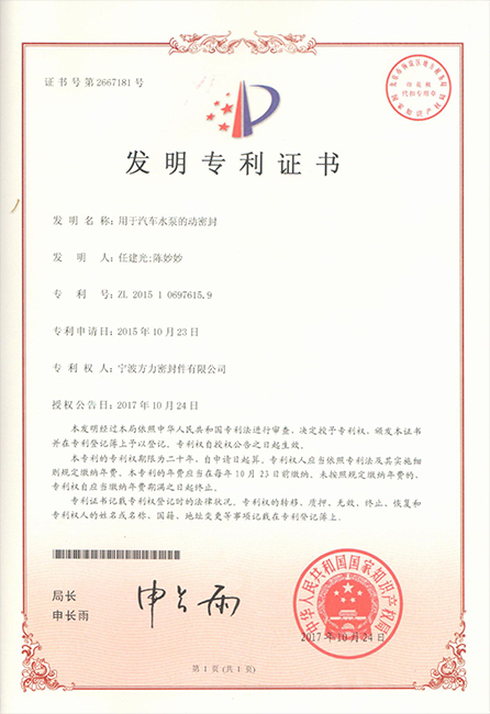 用于汽車水泵的動密封發明專利證書