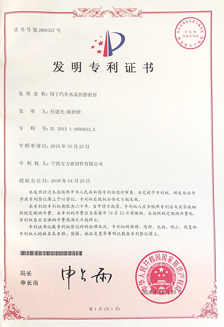 用于汽車水泵的靜密封發明專利證書