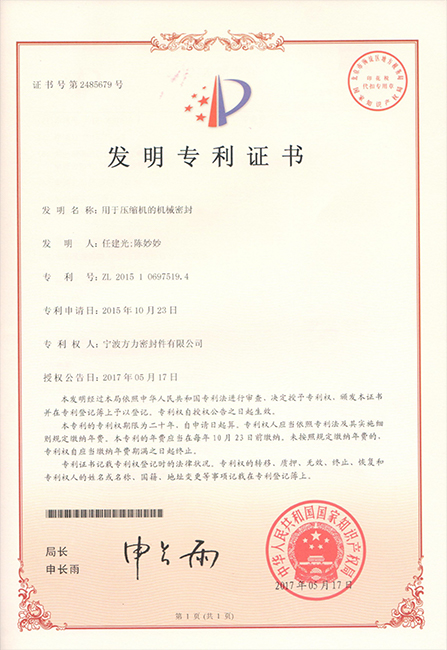 用于壓縮機的機械密封發明專利證書